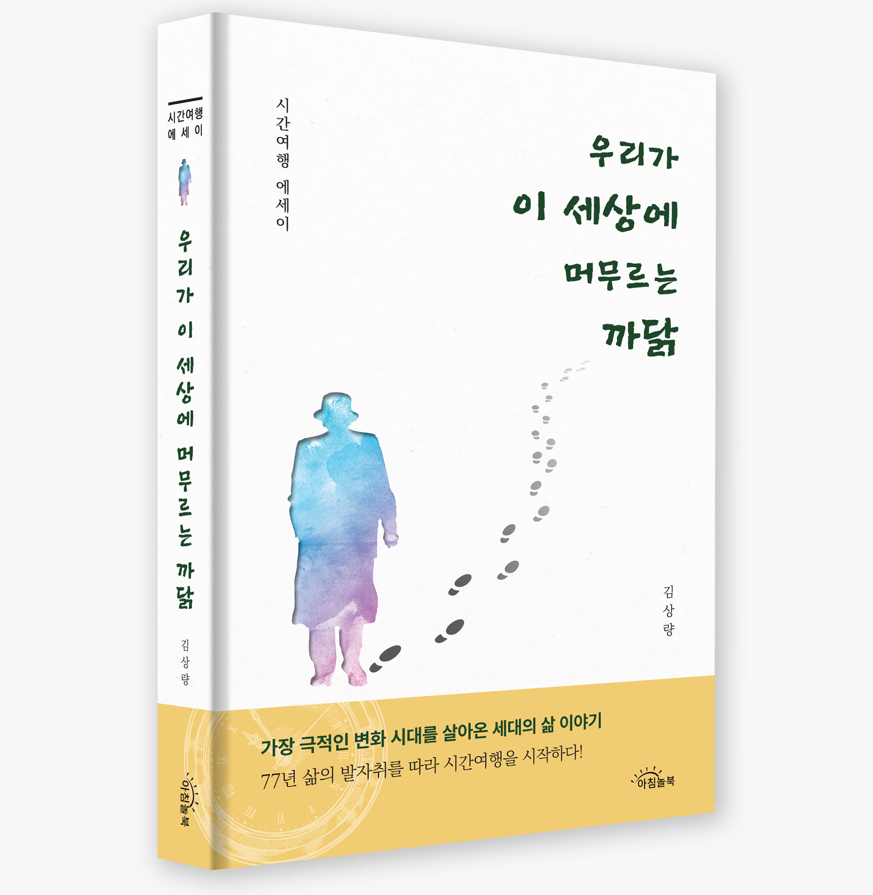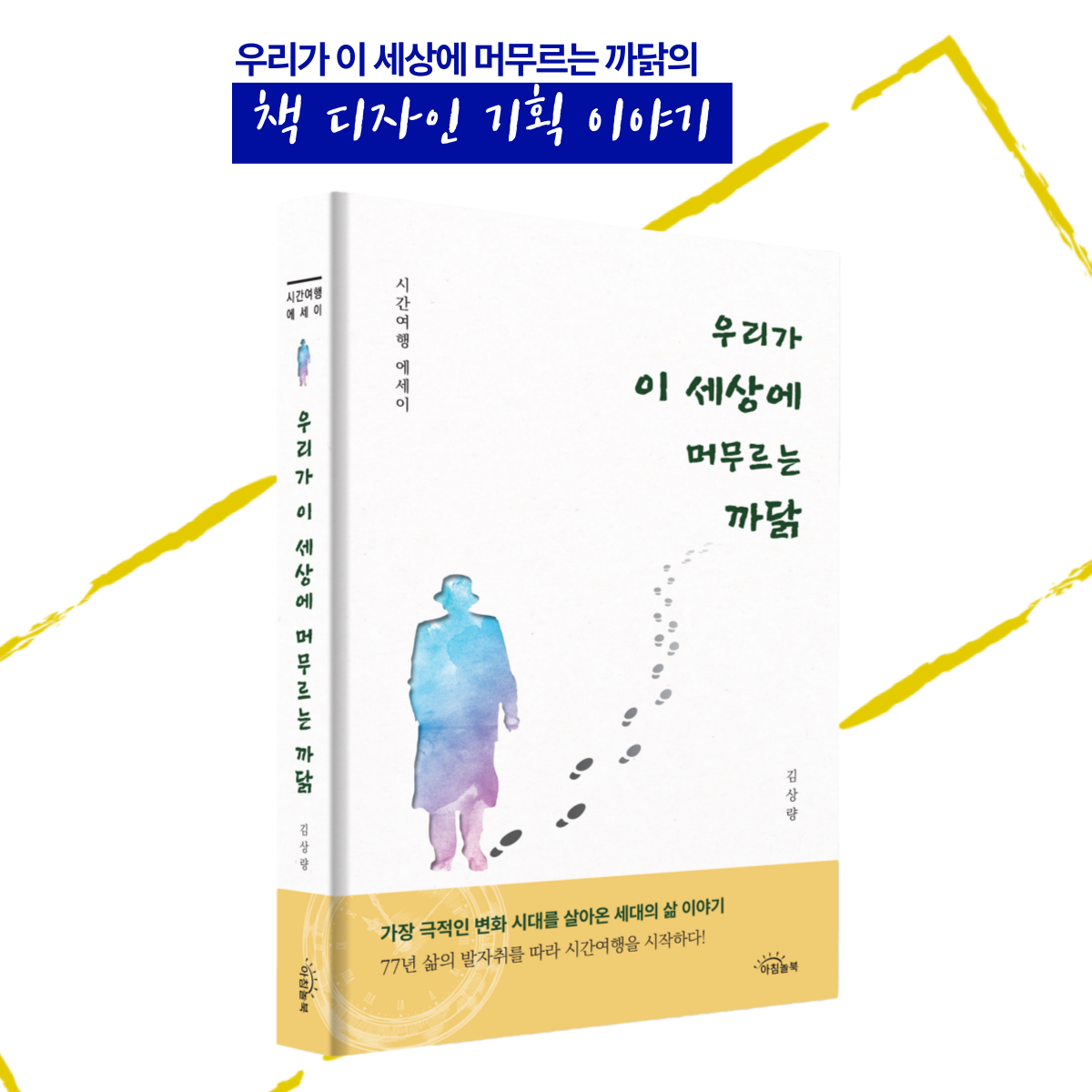 디자인에 있어서, 전체적 이미지는 77년 삶의 발자취를 따라가는 시간여행 에세이 답게  멋진 신사와 발자국 이미지의 결합을 통해 메세지를 압축적으로 전달 하려하였습니다.