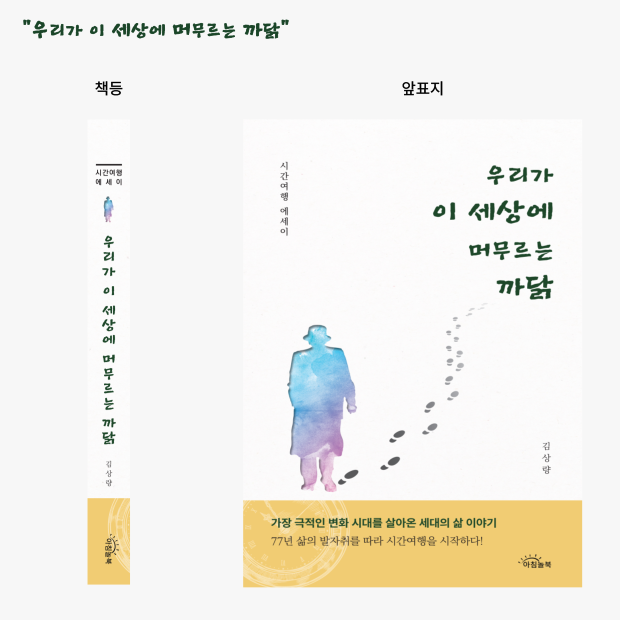 디자인에 있어서, 전체적 이미지는 77년 삶의 발자취를 따라가는 시간여행 에세이 답게 멋진 신사와 발자국 이미지의 결합을 통해 메세지를 압축적으로 전달 하려하였습니다.