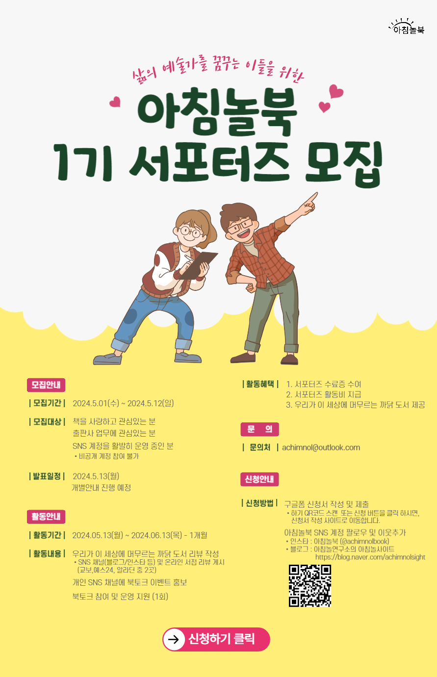 - 모집대상 : 책을 사랑하고 관심 있는 분/ 출판사 업무에 관심 있는 분 / SNS 계정을 활발히 운영 중인 분