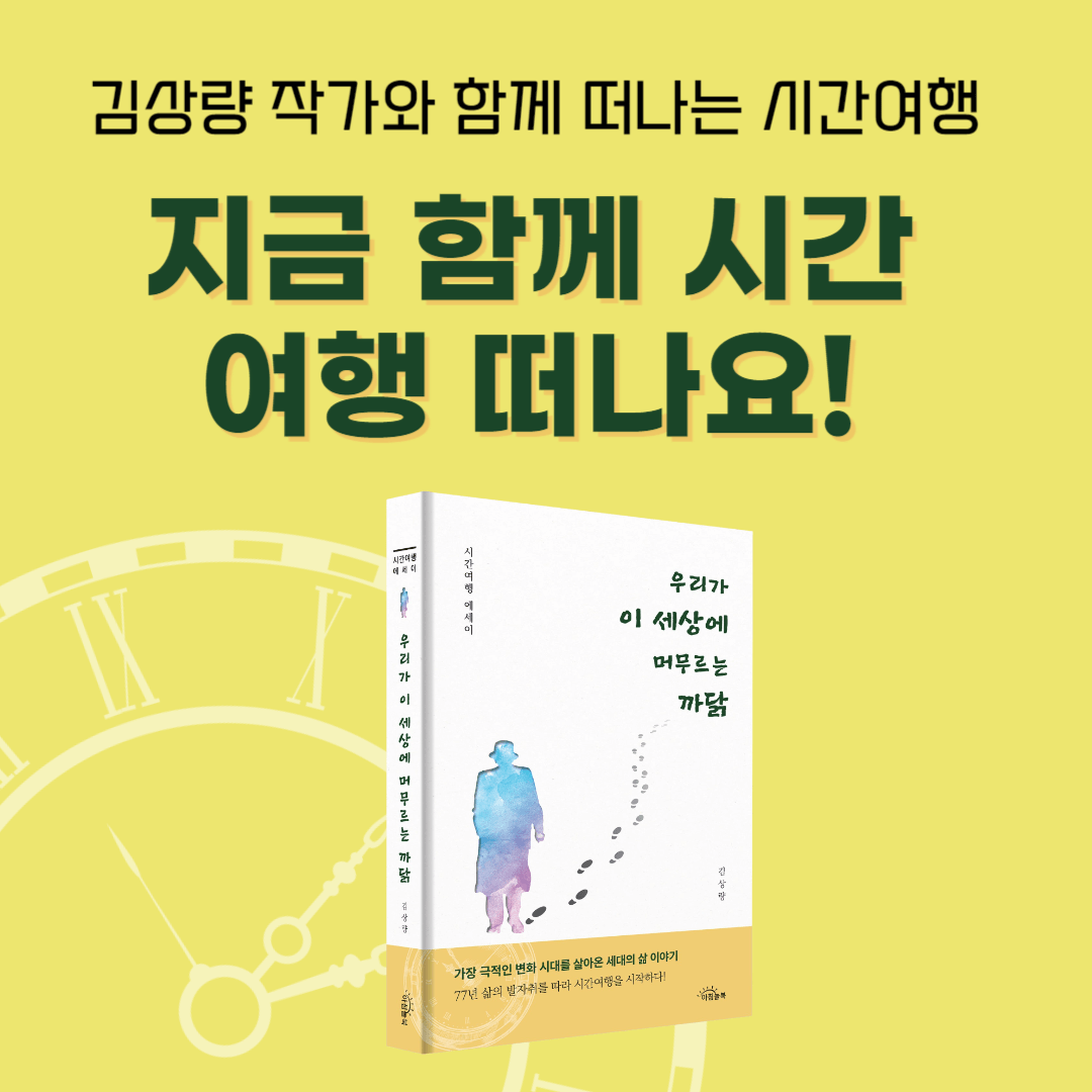 <시간여행 에세이>우리가 이 세상에 머무르는 까닭 출간 기념 북토크가 5월 25일(토) 오후 2시 광교홍재도서관에서 진행 될 예정입니다. 아직 시간여행을 떠날 티켓 예약을 하지 않으셨다면 서두르세요! 티켓 가격은 무료입니다. 우리 김상량 작가님과 함께 떠나는 북토크에서 만나요!