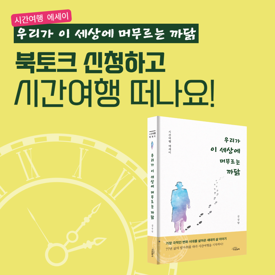 <시간여행 에세이>우리가 이 세상에 머무르는 까닭 출간 기념 북토크가 5월 25일(토) 오후 2시 광교홍재도서관에서 진행 될 예정입니다. 아직 시간여행을 떠날 티켓 예약을 하지 않으셨다면 서두르세요! 티켓 가격은 무료입니다. 우리 김상량 작가님과 함께 떠나는 북토크에서 만나요!