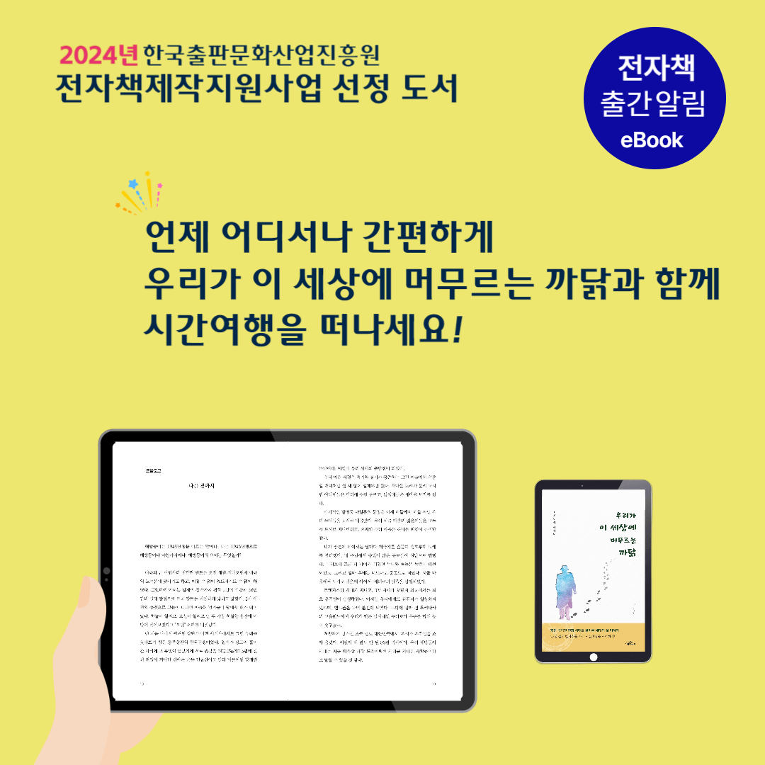 <시간여행 에세이> 우리가 이 세상에 머무르는 까닭이 드디어 전자책으로도 출간이 되었습니다. 지난 5월의 끝에서 2024년 한국출판문화산업진흥원 전자책제작지원사업 도서로 선정되어, 여름의 시작과 함께 전자책 제작을 위해 열심히 달려왔는데요. 어느덧 이렇게 전자책으로 제작 출간하게 되었습니다.